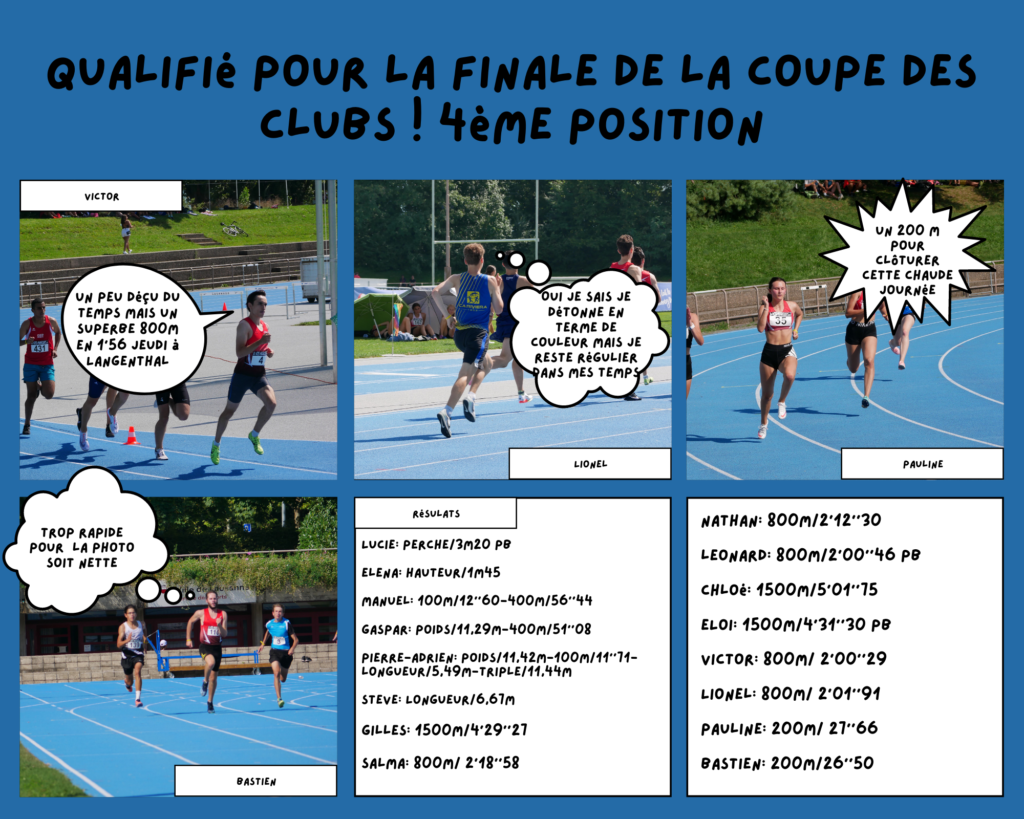 Samedi 4 juin était une journée très chargée pour l’athlétisme Suisse. Les stadistes étaient dispatchés à travers tout le pays. Les demi-fondeurs à Zofingen, les sprinters à Berne, les sauteurs à Genève, notre décathlète à Montpellier (FR) et finalement, la grande majorité à Yverdon pour les Championnats Vaudois Jeunesses.