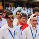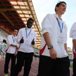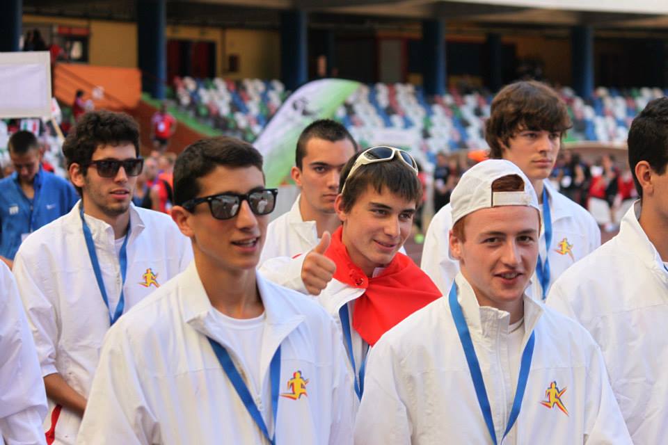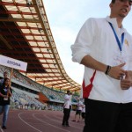 photo (1)Les valises posées, c’est en habit de sport que nous nous sommes retrouvés afin d’aller faire un décrassage. En suivant notre guide, nous nous sommes retrouvés devant un stade ENORME. La surprise fut de taille lorsque nous sommes passés à l’intérieur. Chacun était bouche-bée de la grandeur et de la beauté du stade. Nous nous sentions tout petit à l’intérieur de ce monstre. C’est donc enthousiaste que chacun s’est attelé à un petit décrassage pendant que certains coaches se rendaient à la réunion technique où ils apprirent 50 fois que les imperdables [Ndc : Qui se dit pin ou needle en anglais] se trouveraient dans la « Call room » et non avec les dossards. Quant à nous, athlètes, après notre petit entraînement, nous sommes allés manger avec les autres délégations. C’est donc avec “joie“ que nous avons découvert les jeux de certaines de ces délégations. Ces jeux consistaient à taper sur la table puis, une personne se levait pour dire quelque chose dans une langue assurément inventée par quelqu’un qui qui avait dû s’endormir sur son clavier. C’est donc avec bonne humeur que Amine Reimann a tenté de se prêter au jeu. Plein d’entrain, il s’est mis à frapper sur la table jusqu’à se rendre compte qu’il y avait une soupe devant lui qui sautait à chaque fois qu’il frappait la table… CHAMPION !!! C’est donc les oreilles un brin sifflantes et, pour l’un de nous, la chemise sale que nous sommes allés nous coucher en rêvant du lendemain.